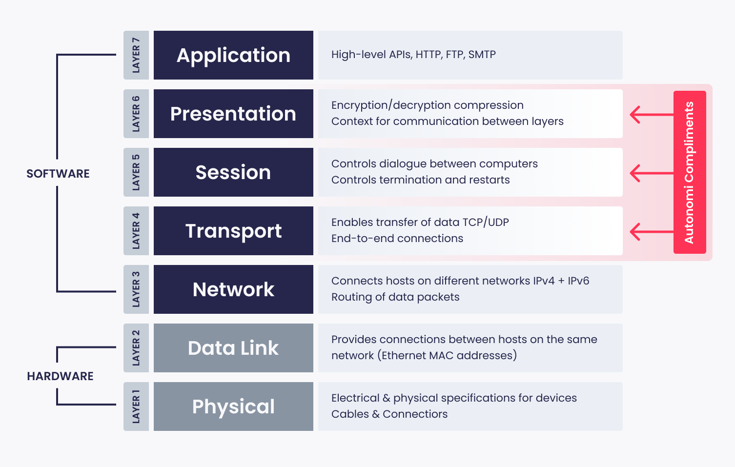 <figure><img src="https://content.gitbook.com/content/IpImJ7Nsy0X1C9wYuy6V/blobs/C61Duutm6Nlt5a7eoEsQ/Network%20Layers%20&#x26;%20Autonomi.png" alt=""><figcaption><p>Autonomi compliments three of the seven networking layers in the OSI model for improved security, privacy and autonomy</p></figcaption></figure>