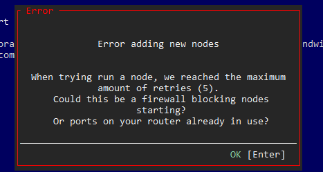 Some Linux users are receiving the "Error adding new nodes. When trying run a node, we reached the maximum amount of retries (5)."